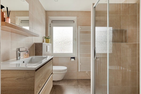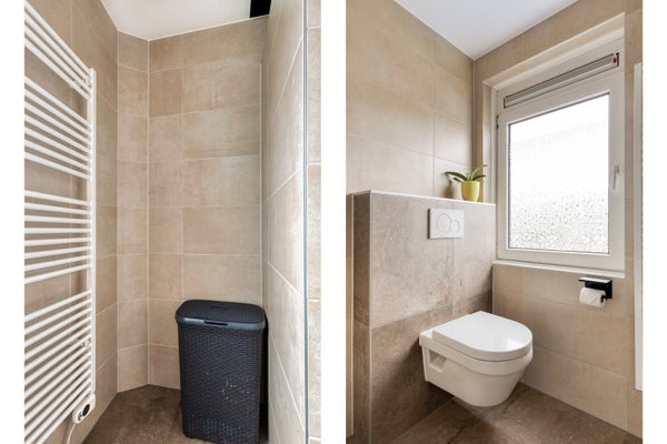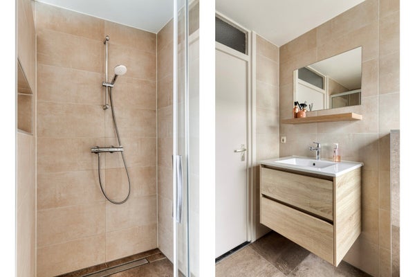 Deze badkamer is volledig vernieuwd in 2023. De wanden zijn plafondhoog betegeld met beige wandtegels die gecombineerd zijn met een bruine tegelvloer. Deze badkamer heeft een gestuukt plafond waarin spotjes aanwezig zijn.