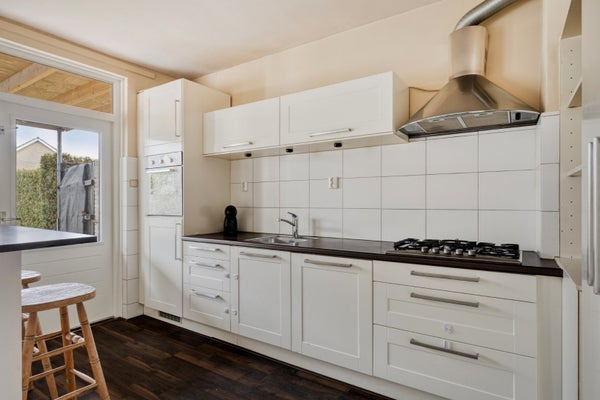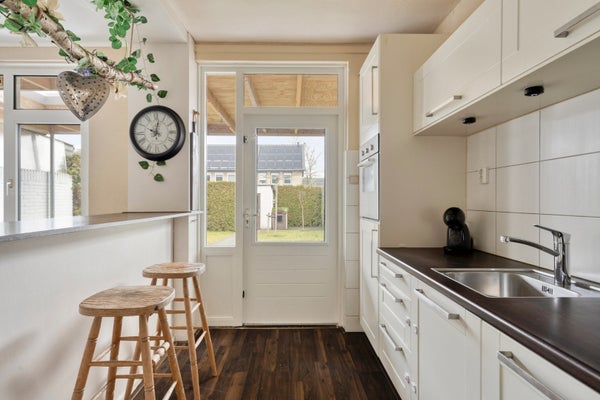 • De keuken staat in halfopen verbinding met de woonkamer. Er is een nette keukeninrichting aanwezig met inbouwapparatuur.