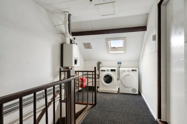 Via een met tapijt beklede vaste trap bereikt u de voorzolder op de tweede verdieping. Op de overloop vindt u de aansluitingen voor de wasmachine en droger en hier hangen de cv-ketel. Er ligt vloerbedekking.
