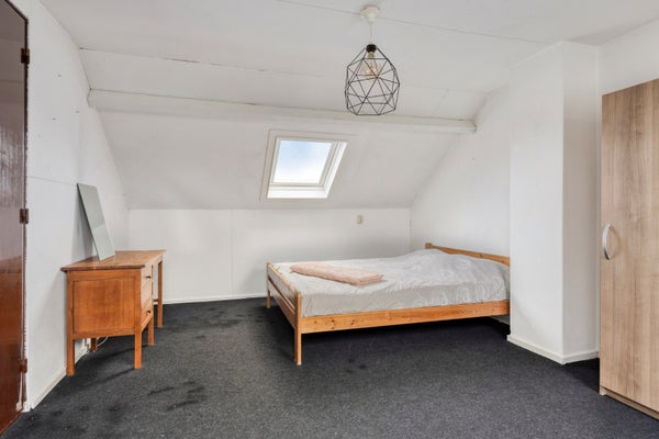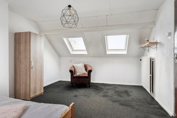 Deze slaapkamer heeft een 3 dakramen en er hangt een radiator. De vloerbedekking is hier doorgelegd, wanden en plafond zijn geschilderd.