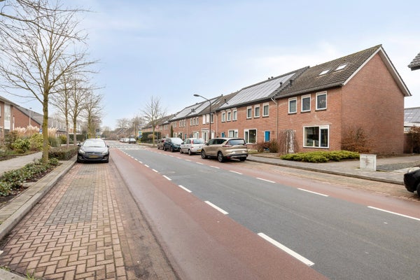 Deze woning is gelegen aan een brede woonstraat met parkeervakken aan beide zijden van de weg. Aan de overzijde van de weg liggen plantenperken waarin hoge bomen staan.