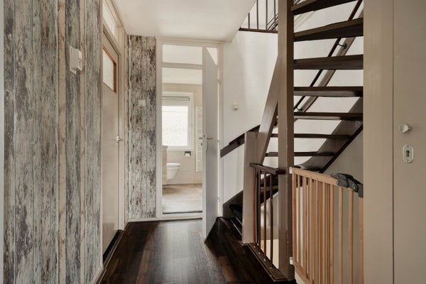 Een houten voordeur geeft toegang tot de hal van de woning. Hier vindt u de meterkast en de trapopgang naar de eerste verdieping. In de hal ligt een tegelvloer en de wanden zijn in een lichte kleur geschilderd. Er is voldoende ruimte voor een kapstok.