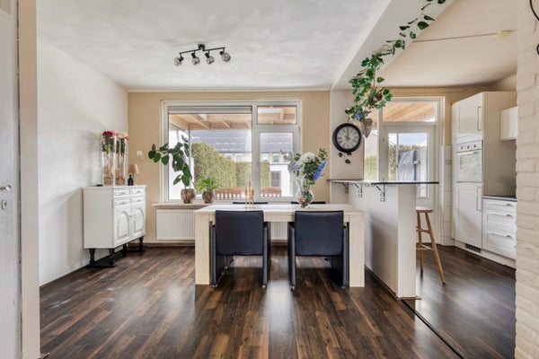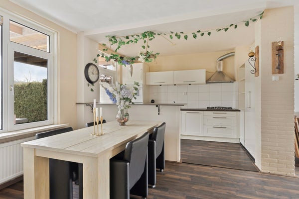 Een royale eettafel laat zich eenvoudig plaatsen aan de tuinzijde naast de keuken. Ook hier zijn grote ramen aanwezig.