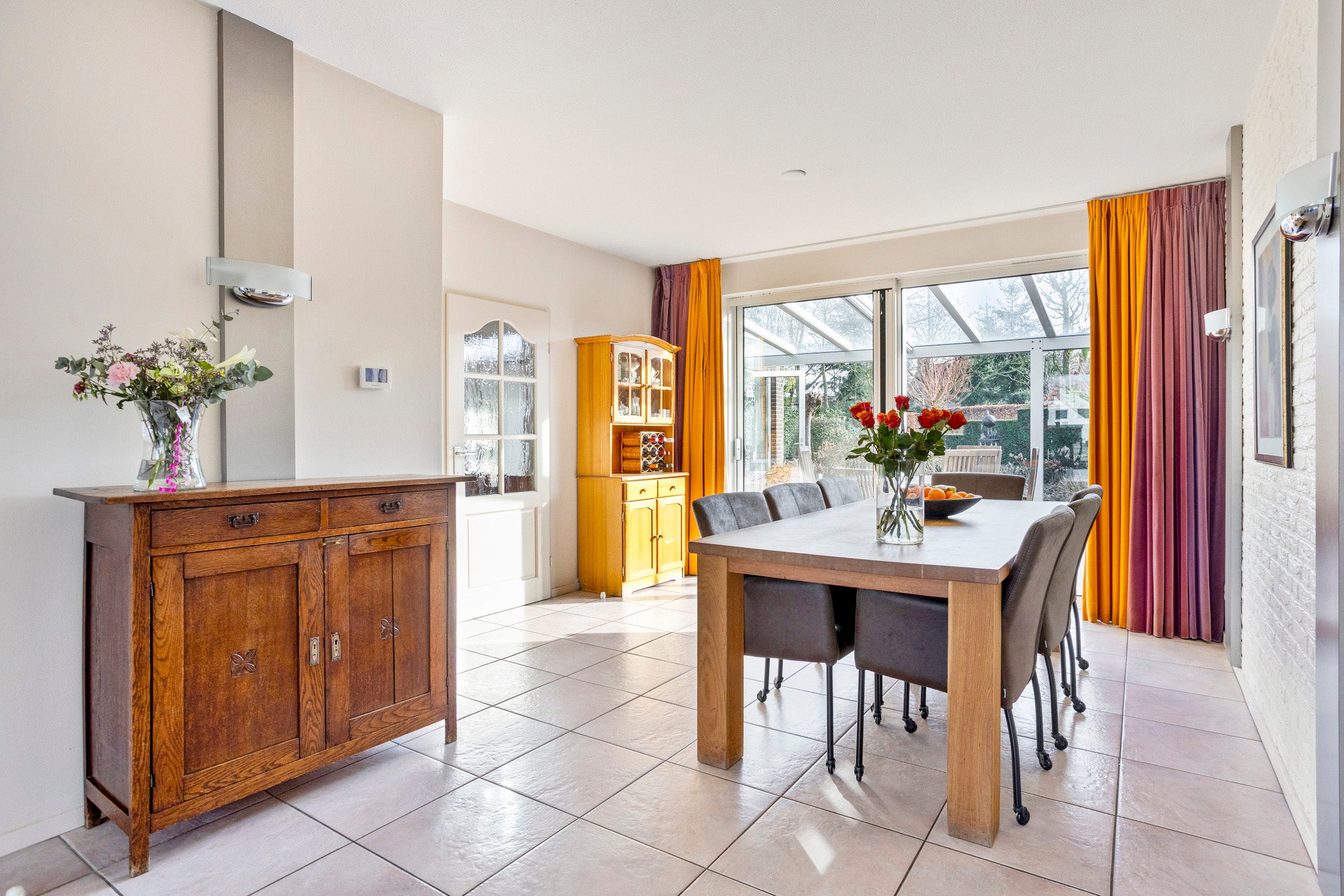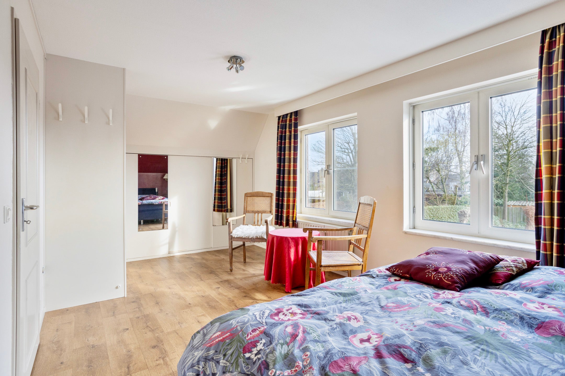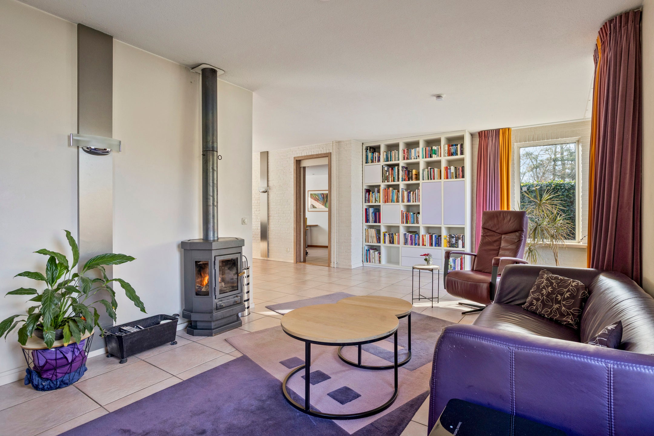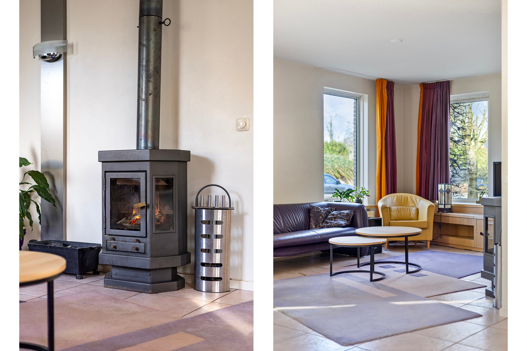 De begane grond beschikt over vloerverwarming en grote ramen voor een prachtig uitzicht op de tuin. De ruime woonkamer omvat een gezellige houtkachel, en de eetkamer heeft een brede schuifpui naar de zonnige tuin. De complete hoekkeuken grenst aan een praktische bijkeuken.