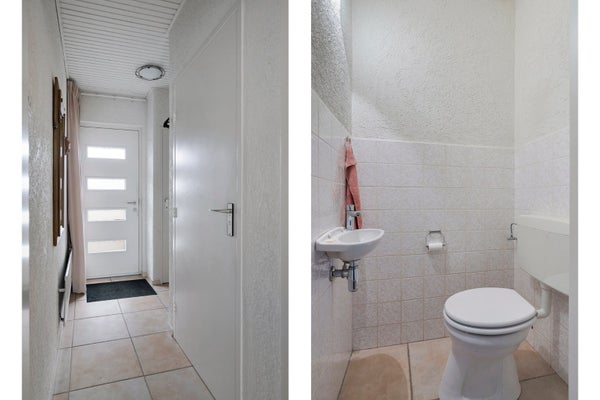 Hal met vloertegels en granolwerk wanden. In de hal bevinden zich de meterkast en het toilet en er is een garderobenis. Via een deur met glasruiten heeft u vanuit de hal toegang tot de woonkamer.