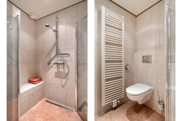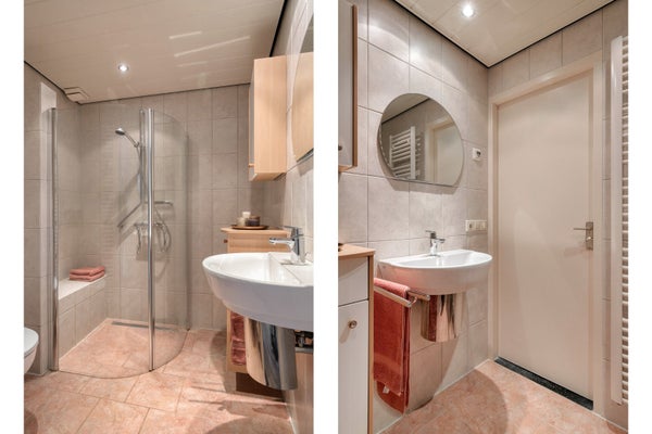 - Neutrale en nette badkamer met douche, vaste wastafel en toilet. In de badkamer is vloerverwarming aanwezig.