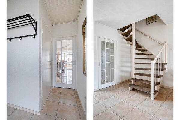 Als u via de trap in de woonkamer naar de eerste verdieping gaat, bereikt u eerst een portaal. Hier bevindt zich de trapopgang naar de tweede verdieping. Er ligt tapijt en de wanden zijn voorzien van spuitwerk.