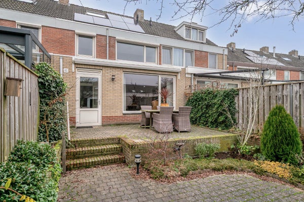 De tuin is onderhoudsvriendelijk aangelegd. Grenzend aan de woning bevindt zich een royaal verhard terras waarboven een elektrisch bedienbare luifel aanwezig is. Via een stenen trap bereikt u het lager gelegen gedeelte van de tuin. Ook dit gedeelte is grotendeels verhard. Langs houten tuinafscheidingen zijn plantenborders aanwezig.
