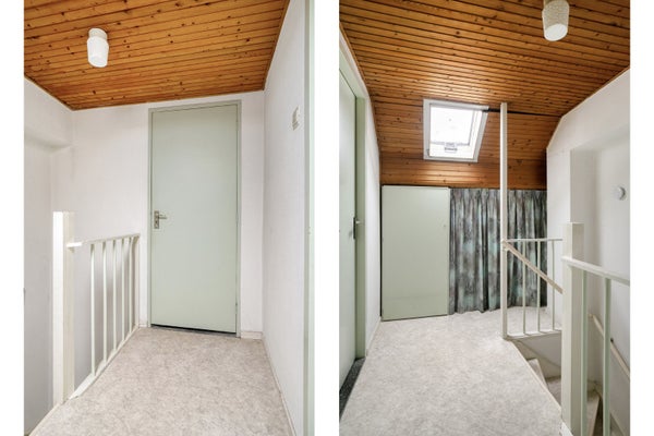 De deuren op de overloop geven toegang tot drie slaapkamers en een badkamer. Er ligt een laminaatvloer de wanden zijn voorzien van spachtelputz.