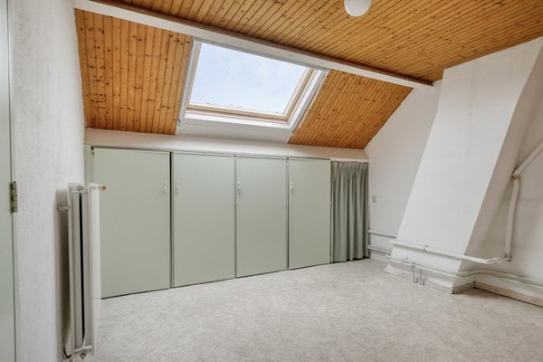 Deze slaapkamer heeft een dakraam aan de tuinzijde en er ligt vloerzeil. Er zijn bergkasten geplaatst onder de schuine delen van het dak. Deze kamer is te verwarmen via een radiator.