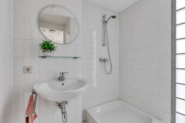 De badkamer is erg ruim. U vindt er een douchecabine met thermostaatkraan en opklapbaar douchezitje, er is een wandcloset en er is een vaste wastafel waarboven een spiegelkast hangt. De wanden zijn plafondhoog betegeld met lichte wandtegels en er is een handdoekradiator aanwezig.