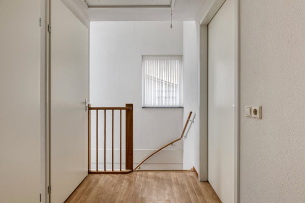 Via een houten trap in de hal bereikt u de overloop op de eerste verdieping. Er is een raam aanwezig en ook de hoge ramen in de vide zorgen voor extra lichtinval. Op deze overloop ligt vloerzeil, de wanden zijn voorzien van spachtelputz. Vanuit deze overloop heeft u toegang tot twee slaapkamers, een badkamer en vaste kast waarin de cv-ketel hangt (merk Nefit, bouwjaar 2001).
