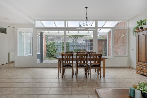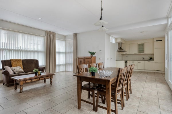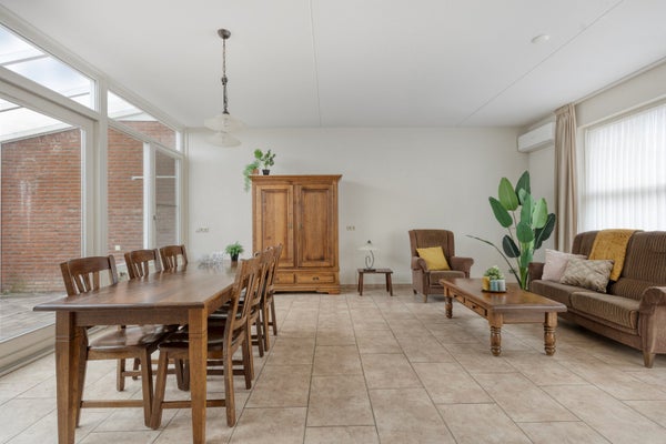 De achtergevel van deze woonkamer bestaat vrijwel volledig uit glas. Door de hier aanwezige schuifpui heeft u rechtstreeks toegang tot het overdekte terras en de patiotuin.