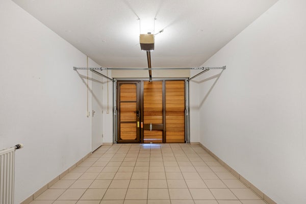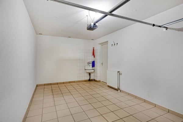 • De garage is van binnenuit te bereiken. Er ligt een tegelvloer en de rolpoort is elektrisch te openen.