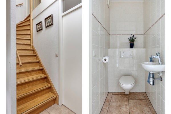 Deze extra brede toiletruimte is plafondhoog betegeld met lichte wandtegels. Er zijn een zwevend toilet en een fonteintje aanwezig. Deze toiletruimte wordt mechanisch geventileerd.