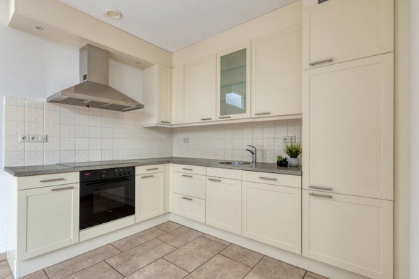 De keuken staat in open verbinding met de woonkamer. De keukeninrichting is in een hoekopstelling geplaatst en uitgevoerd in kunststof. Een oven, een koelkast, een vaatwasser en een inductiekookplaat met 3 kookzones zijn ingebouwd en boven de kookplaat hangt een afzuigkap. Er is veel bergruimte in lades en kastjes. De achterwand is betegeld met lichte wandtegels.