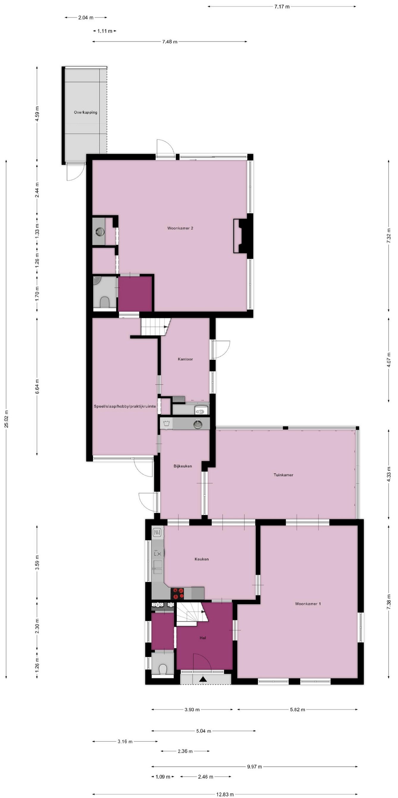 - De tussenwoning heeft een woonoppervlakte van 258 m² en beschikt over 7 kamers, waarvan 6 slaapkamers;