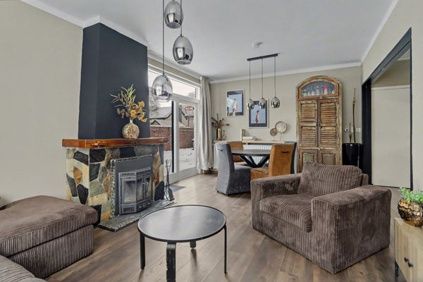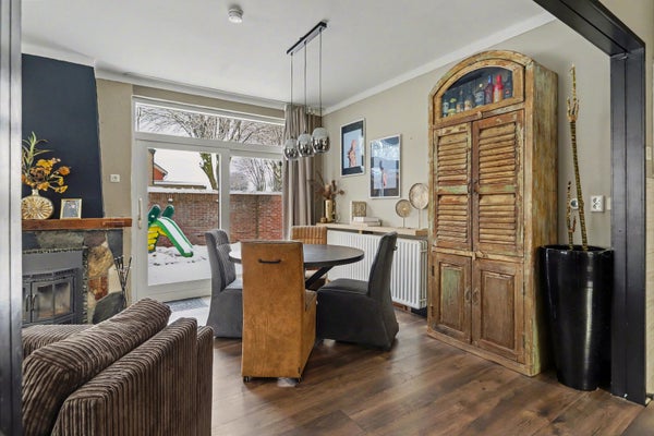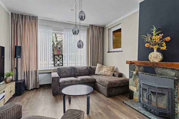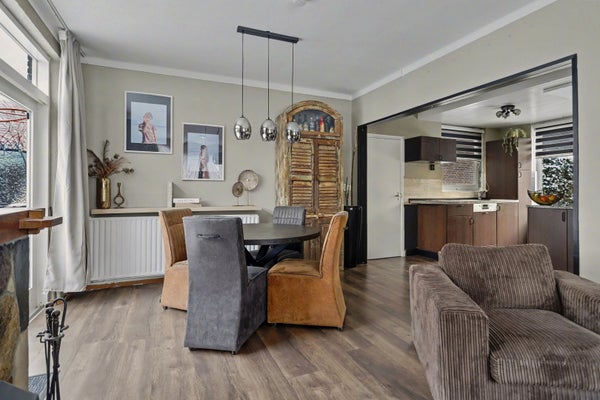 De sfeervolle L-vormige woonkamer met open keuken heeft een oppervlakte van ca. 38 m² en is voorzien van een laminaatvloer. De woonkamer is verder voorzien van een sierschouw met houtkachel, thermostaat, rolluiken en middels de schuifpui is de achtertuin toegankelijk.