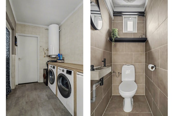 Aansluitend aan de keuken is bijkeuken gelegen voorzien van een laminaatvloer en gedeeltelijk betegelde wanden. De bijkeuken is verder voorzien van de elektrische boiler, aansluitingen ten behoeve van de wasapparatuur en een vaste kast. Vanuit de bijkeuken zijn de slaapkamer, luxe badkamer, apart luxe toilet (2024) voorzien van een closetpot en fonteintje en de achtertuin bereikbaar.