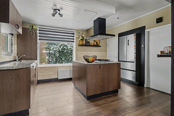 De open keuken beschikt over een zeer fraai houten keukenblok met kookeiland (2021) met een marmeren aanrechtblad en de volgende inbouwapparatuur: 5-pits gaskookplaat, afzuigkap, Amerikaanse koel-vries combi, combi-oven, vaatwasser en de spoelbak. Vanuit de keuken is de kelder te bereiken.