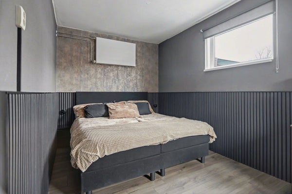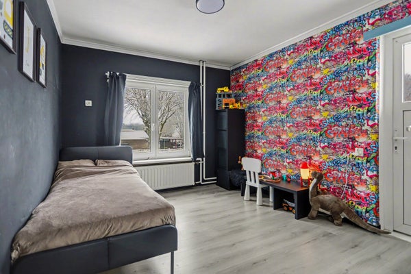 De slaapkamer van circa 12 m² is voorzien van een laminaatvloer en een loopdeur met toegang tot de achtertuin.