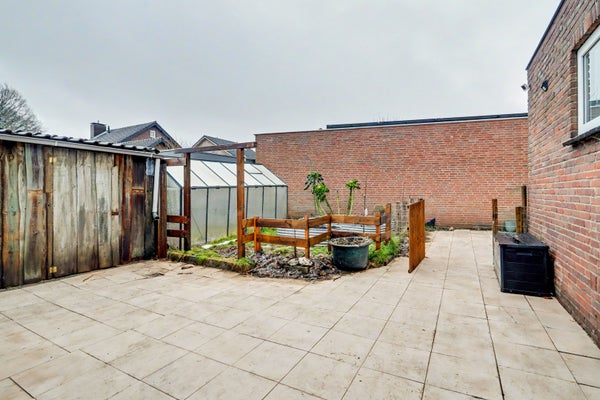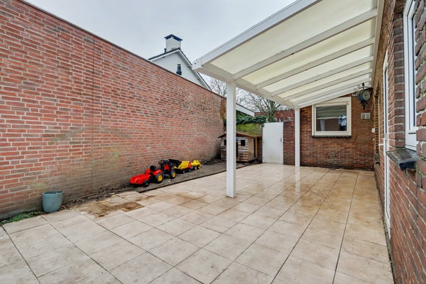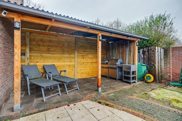 • In de achtertuin staan een houten overkapping en een aluminium overkapping.
