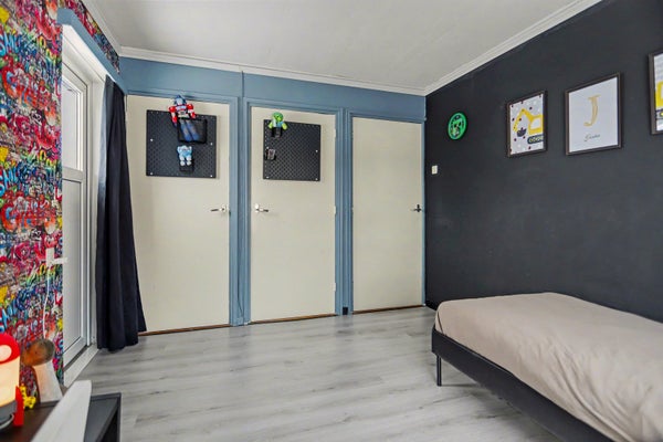 De 3 slaapkamers hebben een oppervlakte van 12 m², 12 m² en 8 m². De 2 slaapkamers aan de achterzijde beschikken over vaste kasten. De grootte slaapkamer aan de achterzijde beschikt verder over een loopdeur met toegang tot een mogelijk dakterras en een rolluik.
