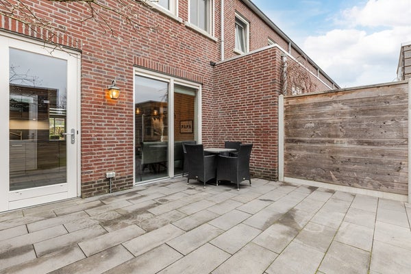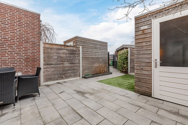 De onderhoudsvriendelijke tuin heeft een terras aan de woning en een houten berging. De berging is ca. 6m2 groot. De tuin is te bereiken middels een vrije achterom naar het achtergelegen parkeerterrein waar de woning de beschikking heeft over een eigen parkeerplaats.