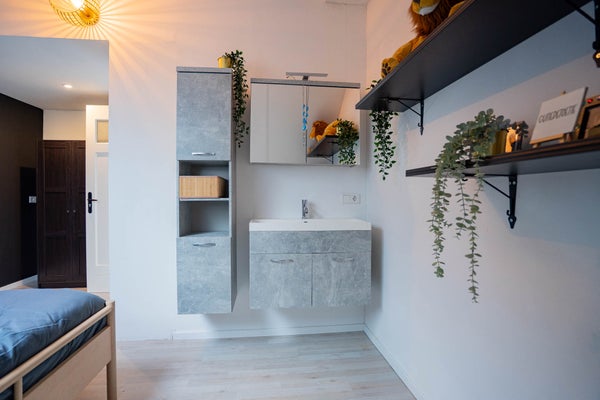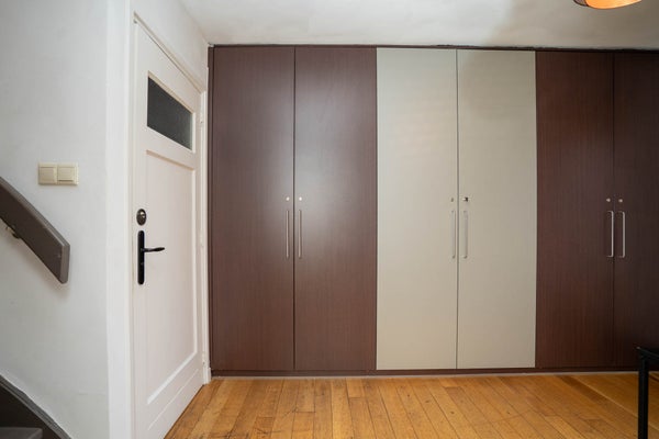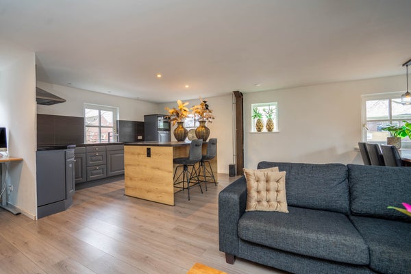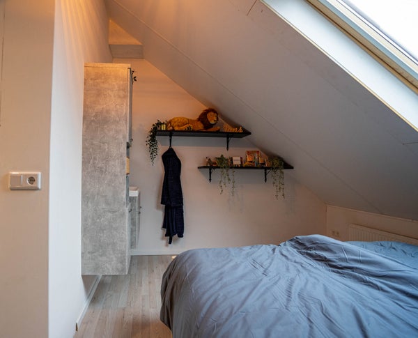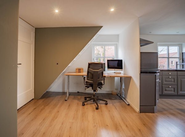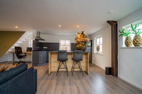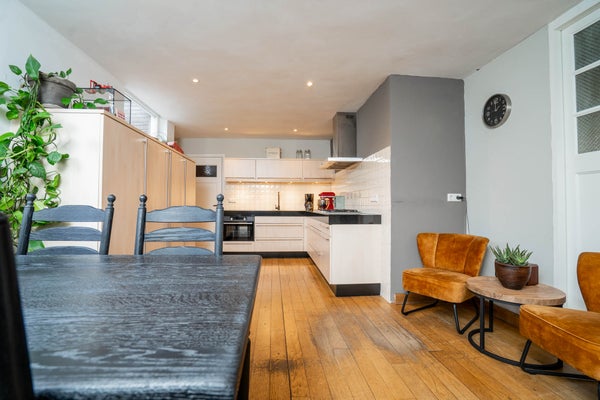 De eerste verdieping is momenteel ingericht als een volwaardig appartement, wat deze woning uitermate geschikt maakt voor dubbele bewoning. Hier vindt u een ruime woonkamer met open keuken en barretje, veel lichtinval en een nette afwerking met laminaatvloeren en gestuukte wanden en plafonds. De indeling is slim en praktisch, met voldoende ruimte voor een zit- en eethoek. De slaapkamer op deze verdieping is royaal van formaat en voorzien van vloerbedekking, gestuukte wanden en plafond en een moderne kastenwand.