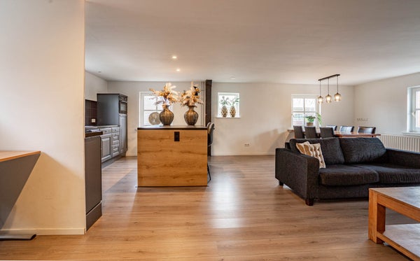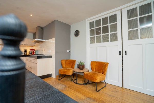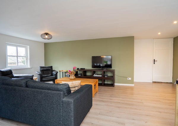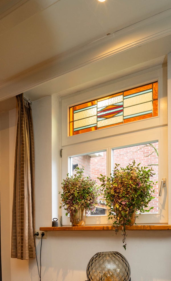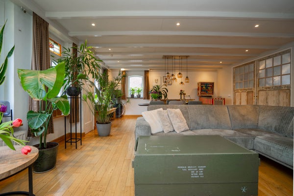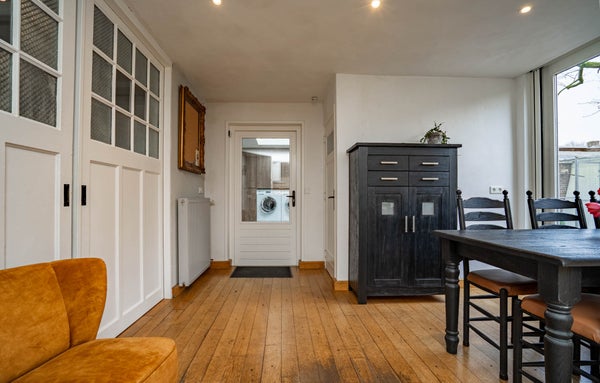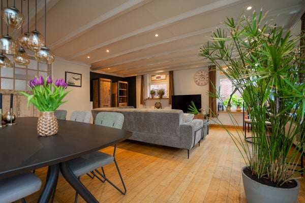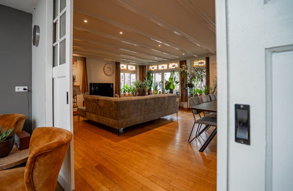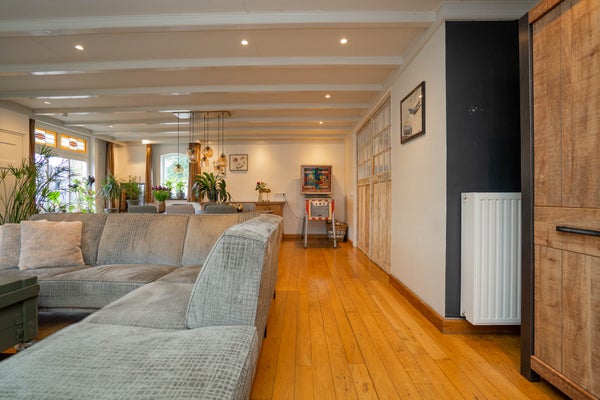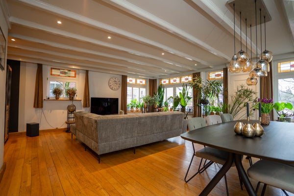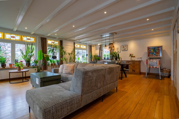 De woonkamer is bijzonder ruim en ademt karakter. De houten vloer, de balken aan het plafond en de charmante glas-in-loodramen zorgen voor een warme en sfeervolle uitstraling. Dankzij de vele raampartijen profiteert u hier van een prettige lichtinval en de royale afmetingen maken het eenvoudig om meerdere zit- of leefhoeken te creëren. Dit is een woonkamer waar u zich direct thuis voelt en waar u volop ruimte heeft om te leven en te genieten.