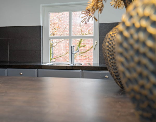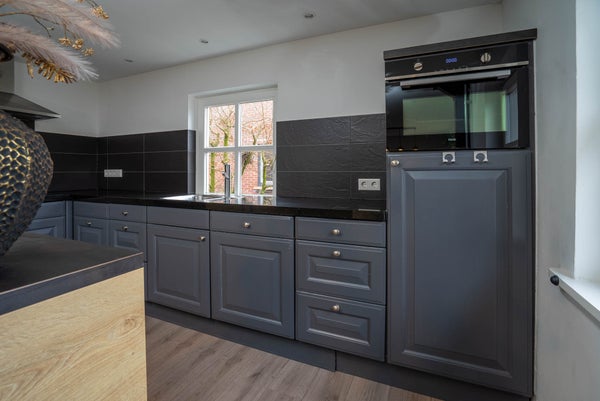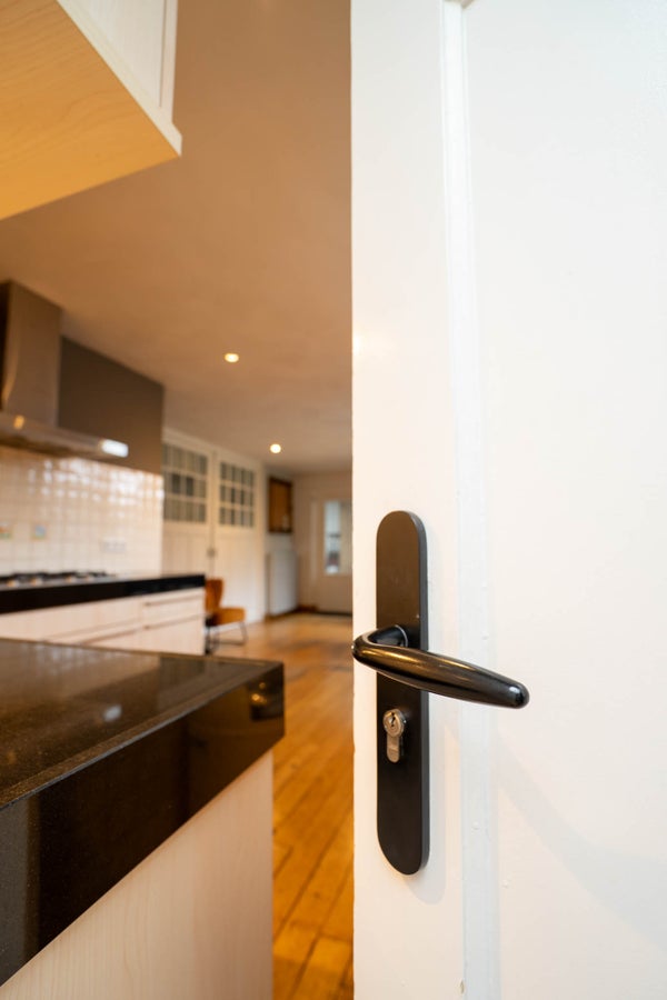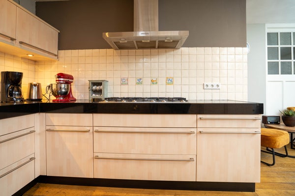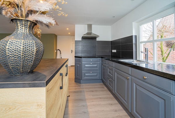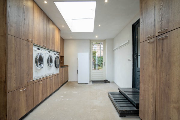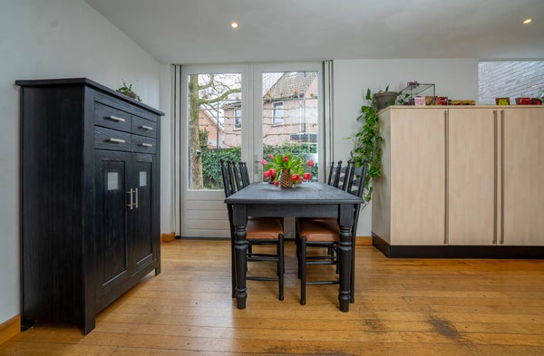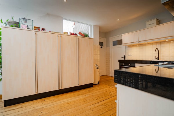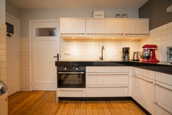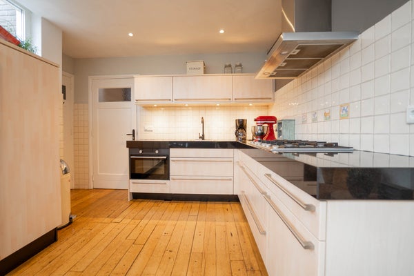 Aangrenzend vindt u de royale keuken, uitgevoerd in een L-opstelling en groot genoeg om ook een eethoek te plaatsen. De keuken is keurig onderhouden en voorzien van een oven en gasfornuis. Via de tuindeur loopt u zo naar buiten en vanuit de keuken heeft u tevens toegang tot de kelder. Vanuit de keuken bereikt u ook de bijkeuken, die opvallend ruim en praktisch is ingericht. Hier vindt u een modern ingebouwde kastenwand met daarin de witgoedaansluitingen, een extra keukenblok met wasbak en een lichtstraat die zorgt voor prettig daglicht. Daarnaast beschikt deze ruimte over een eigen entree aan de straatzijde en toegang tot de tuin, wat het geheel bijzonder functioneel maakt.