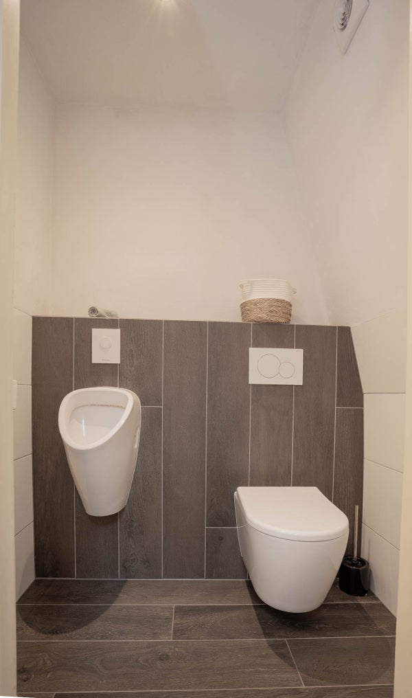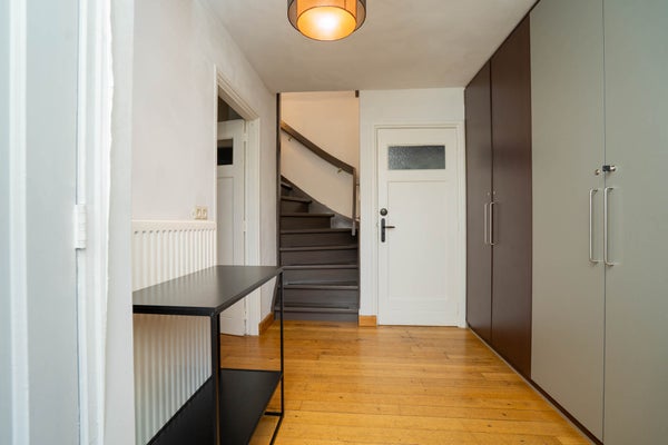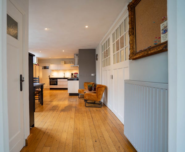 Bij binnenkomst ervaart u direct de ruimte. De royale entree is afgewerkt met een houtenvloer en strak gestuukte wanden en plafonds en beschikt over ingebouwde kastruimte, een toiletruimte en de trapopgang naar de eerste verdieping. Een fijne binnenkomst die meteen de toon zet voor de rest van het huis.