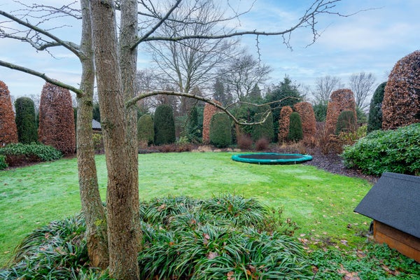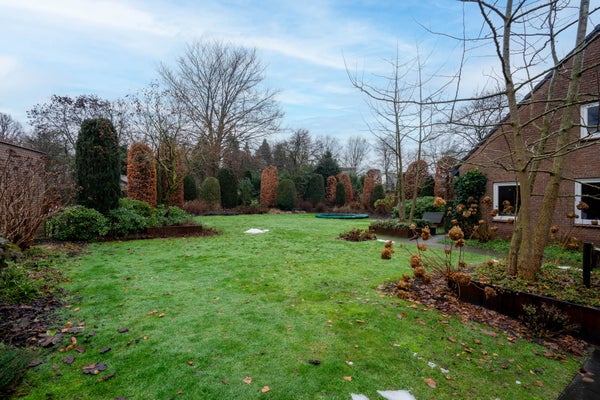 De tuin is royaal van formaat, keurig onderhouden en omgeven door veel privacy. Het uitgestrekte gazon oogt verzorgd en wordt moeiteloos onderhouden dankzij de zelfrijdende grasmaaier. Hier geniet u van rust, ruimte en het buitenleven in optimale vrijheid.