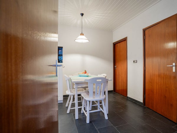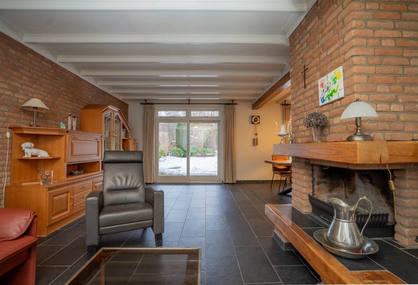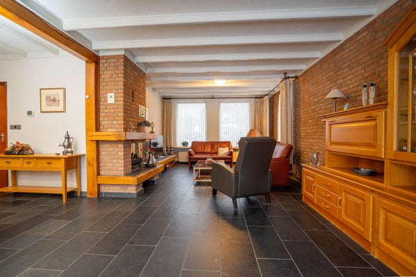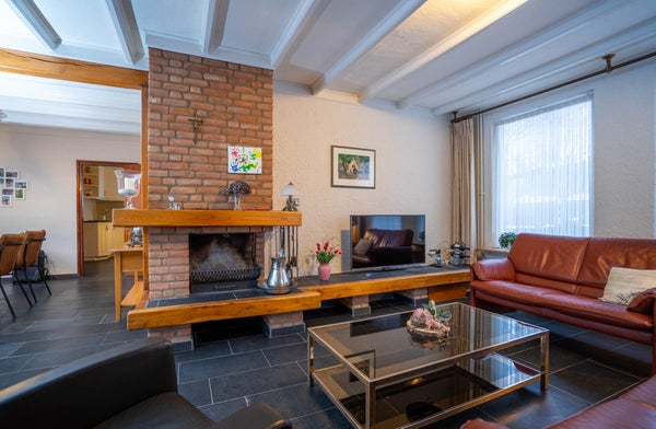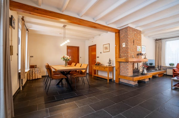 Een heerlijke L-vormige living met tegelvloer, schoonmetsel- en stucwerk wanden en meerdere raampartijen voor rijkelijke daglichttoetreding. De houtkachel zorgt voor warmte en sfeer in de winter, terwijl de schuifpui u in de zomer direct met de tuin verbindt. De L-vorm biedt moeiteloos plaats aan een grote eettafel en een ruime kast—ideaal voor gezellige etentjes of een speelhoek.