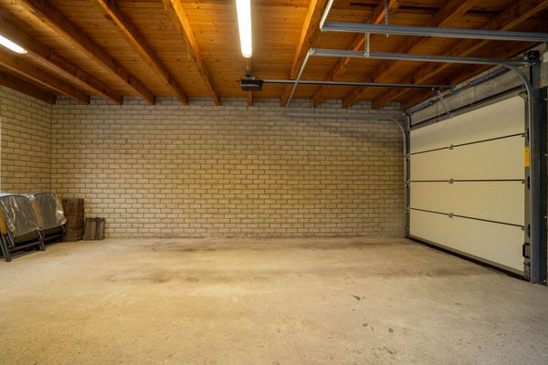 Een bijzonder grote garage met vlizozolder: ideaal voor opslag, een hobby aan huis of als klusruimte met extra bergruimte bovenin.