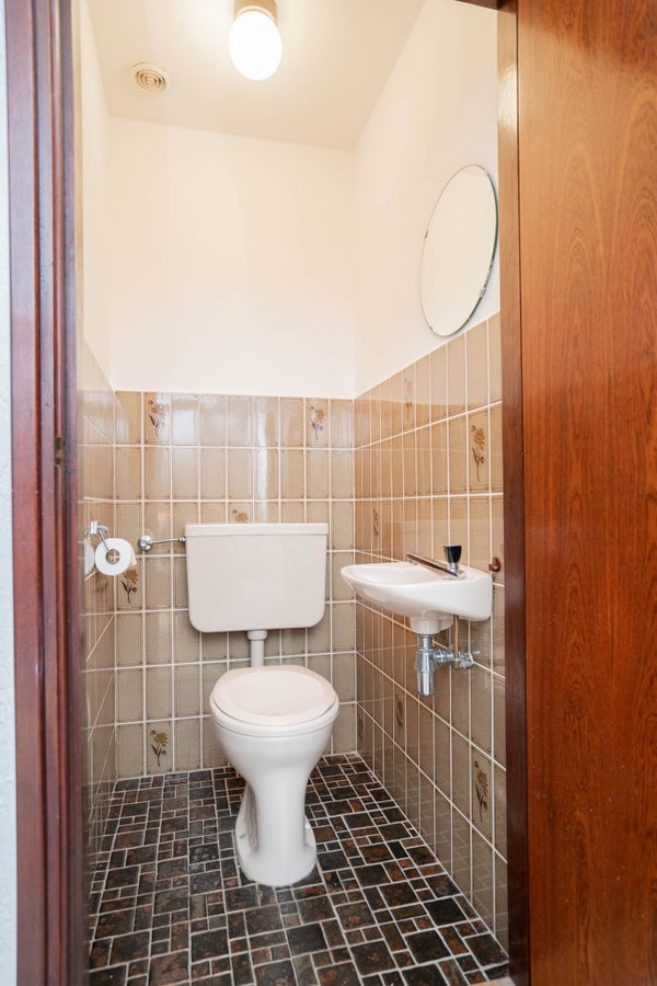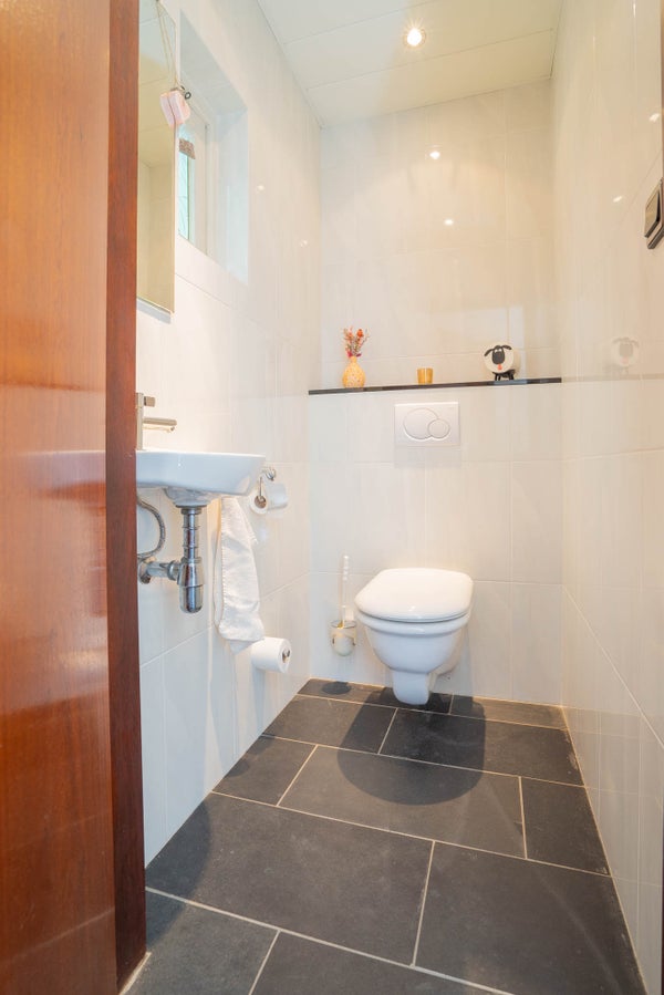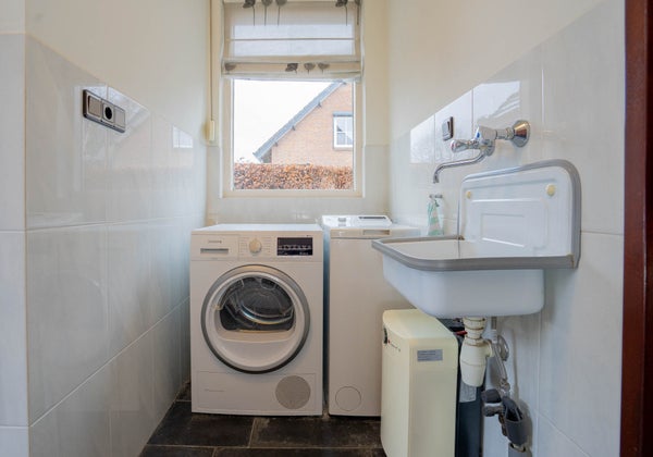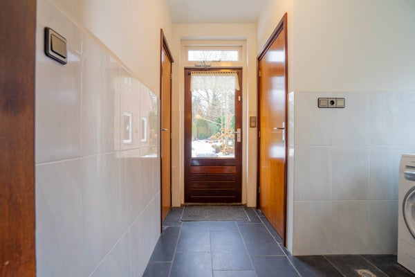 Praktische toegang vanuit de tuin met opstelling wasmachine, wasbakje en toiletruimte — perfect om natte jassen of sportschoenen direct weg te zetten.