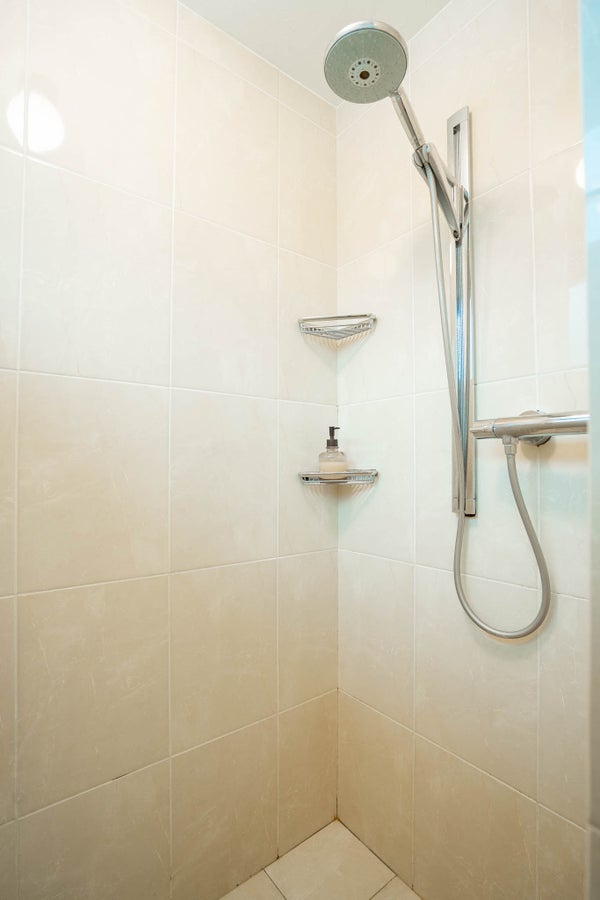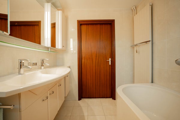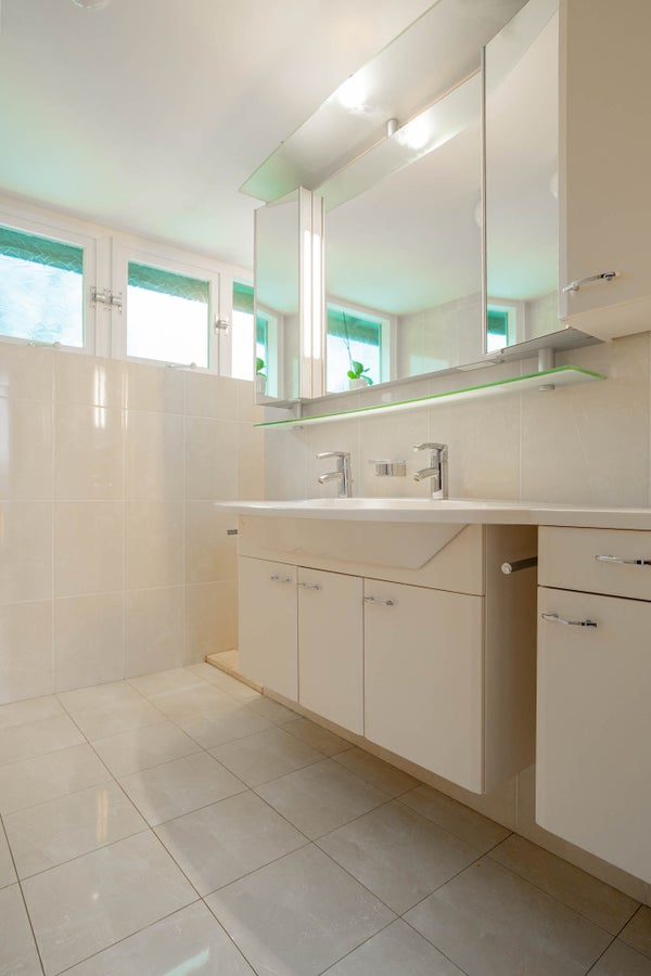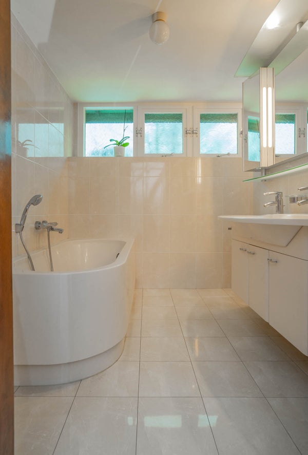 Een royale, volledig betegelde badkamer met ramen voor natuurlijke ventilatie, ligbad, inloopdouche, dubbele wastafel en een grote radiator voor extra comfort. Het toilet bevindt zich apart van de badkamer: wel zo praktisch!