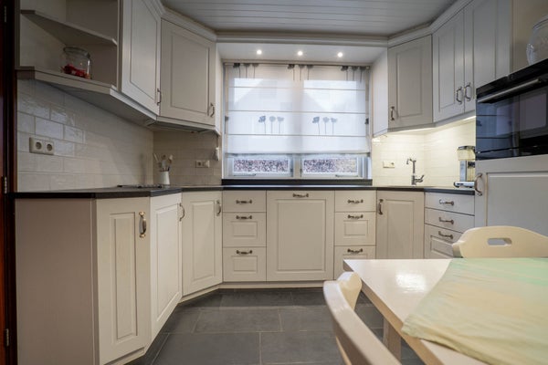 Een goed onderhouden keuken met raam voor prettige lichtinval en zicht naar buiten. Uitgerust met koelkast, combi-oven, inductiekookplaat en vaatwasser — alles wat u nodig heeft om fijn te koken.