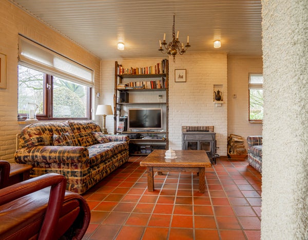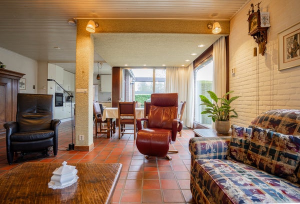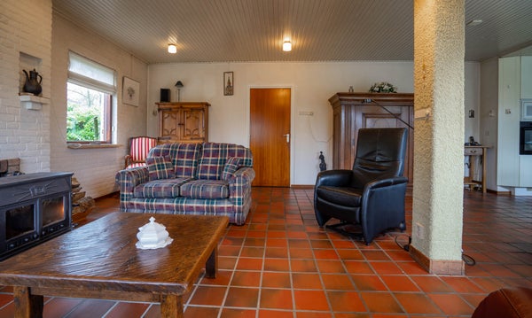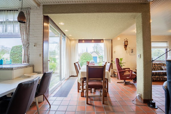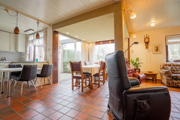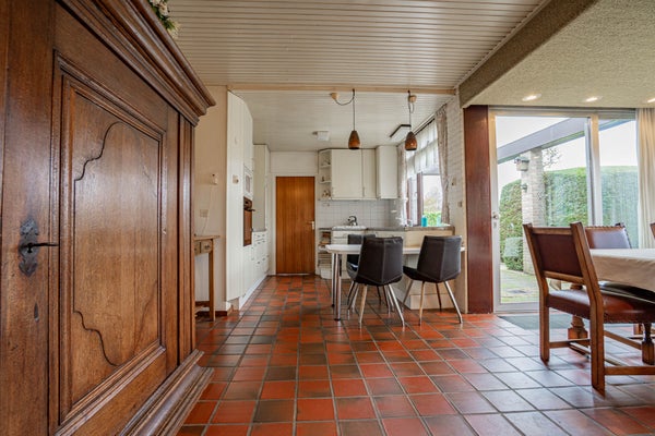De woonkamer is een prettige, lichte leefruimte met een plavuizen vloer en wit geschilderde steense muren. Dankzij de vele raampartijen geniet u hier van veel natuurlijk licht en een fijne zithoek. Aansluitend bevindt zich een mooie ruimte voor de eettafel, met een schuifpui die direct toegang geeft tot de tuin en zorgt voor een prettige verbinding tussen binnen en buiten.