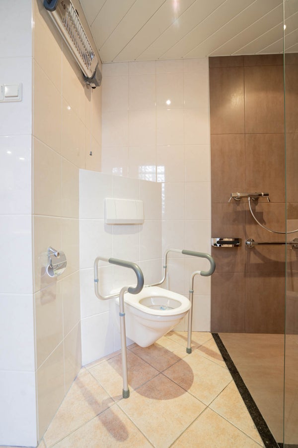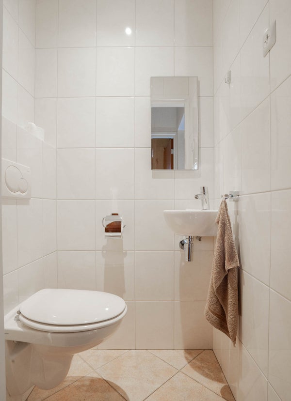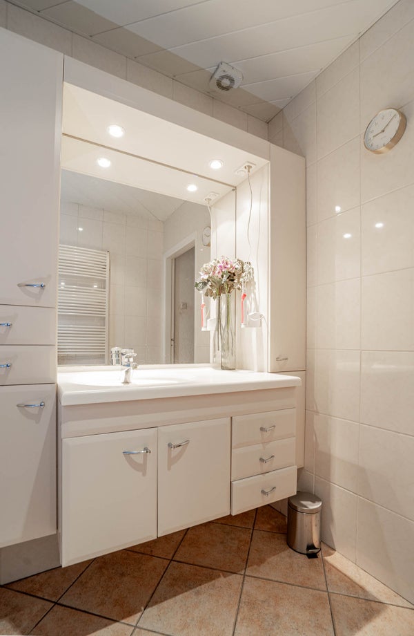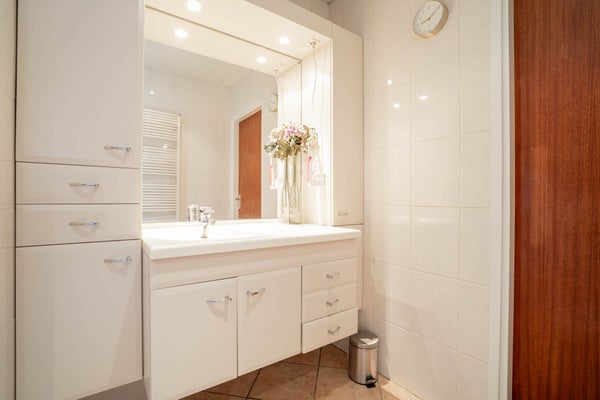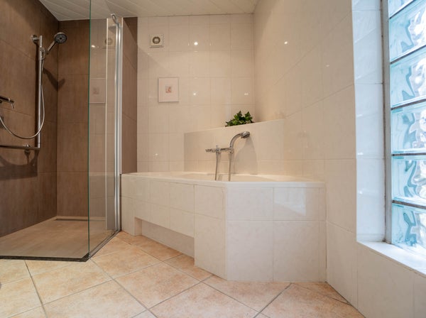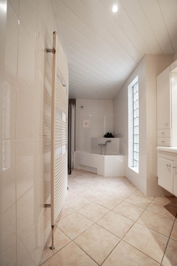 De badkamer is royaal opgezet, volledig betegeld en keurig onderhouden. U vindt hier een wastafel met meubel, een ligbad, een inloopdouche en een toilet. Een nette badkamer met een solide basis.