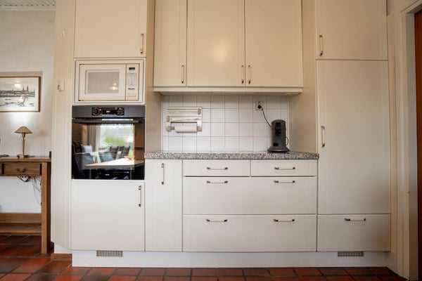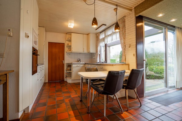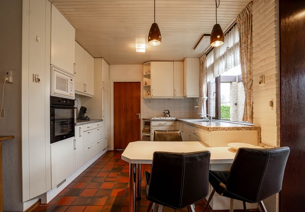 De keuken ligt aansluitend aan de woonkamer en heeft een fijne doorloop. De plavuizen vloer loopt hier netjes door, wat zorgt voor een rustig en samenhangend geheel. De keuken is goed ingedeeld, voorzien van een groot raam voor veel lichtinval en uitgevoerd in een degelijke, neutrale stijl. U beschikt hier over een oven, gasfornuis, magnetron en koelkast.