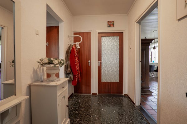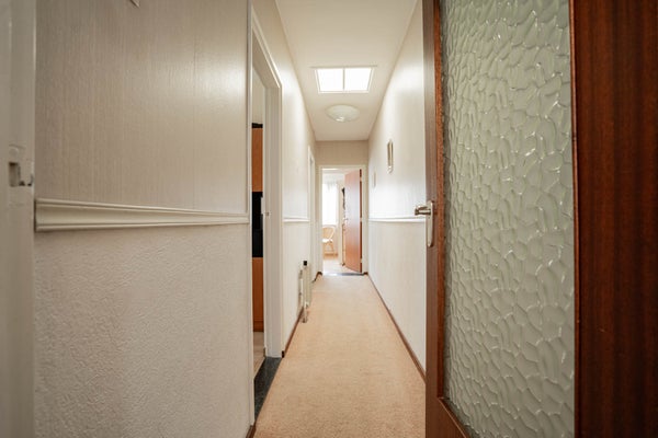 Bij binnenkomst komt u in de entree, die toegang geeft tot de woonkamer, een lange hal richting de slaapkamers, de badkamer en de separate toiletruimte.