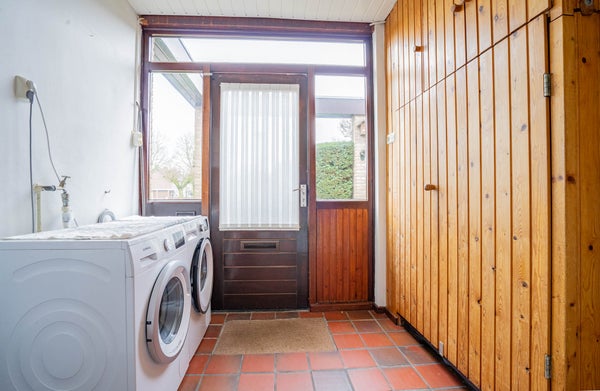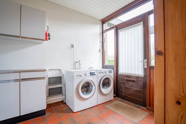 Vanuit de keuken bereikt u de bijkeuken, waar eveneens de plavuizen vloer is doorgelegd. Deze ruimte is zeer praktisch en biedt plaats aan de witgoedopstelling en extra bergruimte. Daarnaast fungeert de bijkeuken ook als hal vanuit de tuin, dankzij de directe toegang naar buiten.