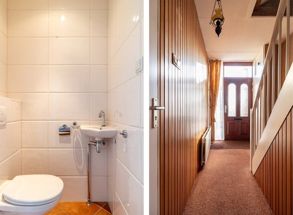 Via de entree komt u in de hal met meterkast, toilet en trapopgang naar de eerste verdieping. Vanuit de hal heeft u toegang tot de woonkamer, die dankzij de ligging prettig licht is en beschikt over een buitendeur naar de tuin. De open keuken sluit aan op de royale bijkeuken, waar zich tevens de aansluitingen voor het witgoed bevinden. Deze ruimte is uitgevoerd met een betonvloer en biedt extra bergruimte.