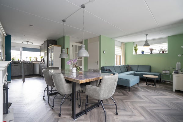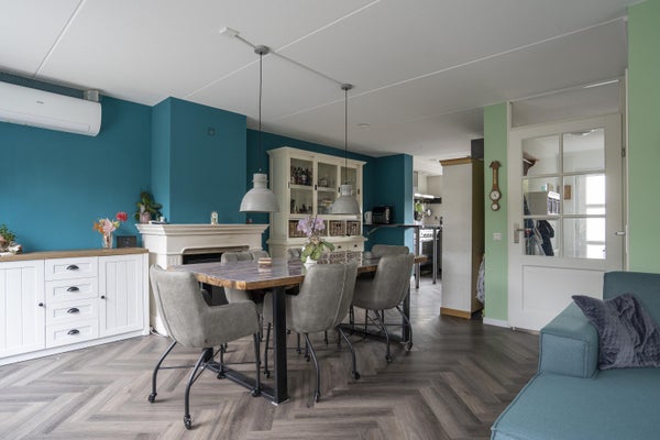 De woonkamer is in te delen in een zitgedeelte en eetgedeelte en is voorzien van een PVC vloer, trapkast, airco en open haard.