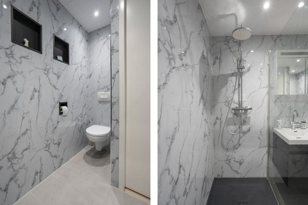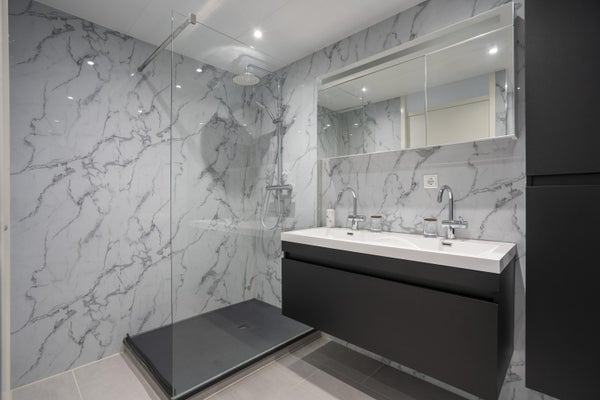 De badkamer is voorzien van wandpanelen (marmeren look) met een badkamermeubel voorzien van een dubbele kraan, douche en tweede toilet.