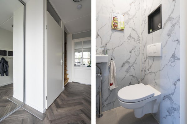 Entree met ruime hal voorzien van meterkast en toiletruimte voorzien van een zwevend closet met fonteintje.