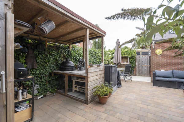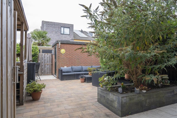 De gezellige achtertuin is rijk aan sierstruiken en bomen. Tevens is de achtertuin voorzien van een achterom, 2 bergingen (hout en steen) en een overkapping met optie tot buitenkeuken.