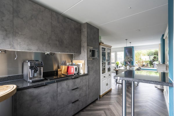 De keuken is gelegen aan de voorzijde van de woning. Deze complete keuken is o.a. voorzien van een M-System fornuis met 6-pits kookplaats( twee wokbranders) , Schouw/afzuigkap,vaatwasser, koelkast , magnetron en een horeca kraan. Tevens is de keuken voorzien van voldoende kastruimte.