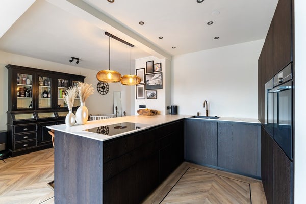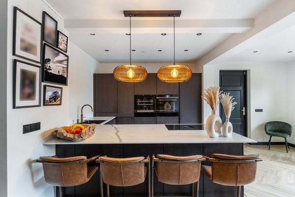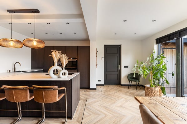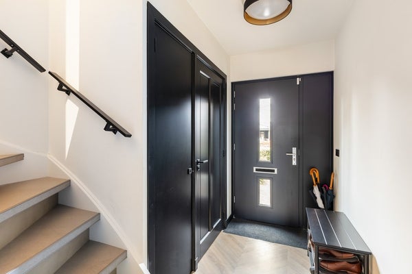 Via de entree kom je binnen in de hal, die toegang biedt tot de toiletruimte met wandcloset en fontein, de meterkast met glasvezelaansluiting, de trapopgang naar de eerste verdieping en de woonkamer. De gezellige woonkamer, bereikbaar via een moderne stalen deur, is aan de voorzijde van de woning gelegen. Dankzij het grote raam aan de voorzijde geniet je hier van een prettig uitzicht over de straat. Tevens is er in de woonkamer een trapkast aanwezig met extra bergruimte, waarin ook de verdeler van de vloerverwarming en de waterontharder zijn ondergebracht. Aan de achterzijde bevindt zich de uitgebouwde, royale woonkeuken: een heerlijke plek voor het hele gezin. De luxe keuken met schiereiland is voorzien van diverse hoogwaardige inbouwapparatuur, waaronder een inductiekookplaat met geïntegreerde afzuiging, vaatwasser, koelkast, vriezer, Quooker, wijnkoeler en een combi(stoom)oven. Via de openslaande deuren stap je zo het terras op en kun je optimaal genieten van het buitenleven. Vanuit de keuken is bovendien de garage direct bereikbaar. De begane grond heeft een strakke en moderne uitstraling en is afgewerkt met een visgraatvloer met vloerverwarming, strak gestuukte wanden en plafonds met inbouwspots.